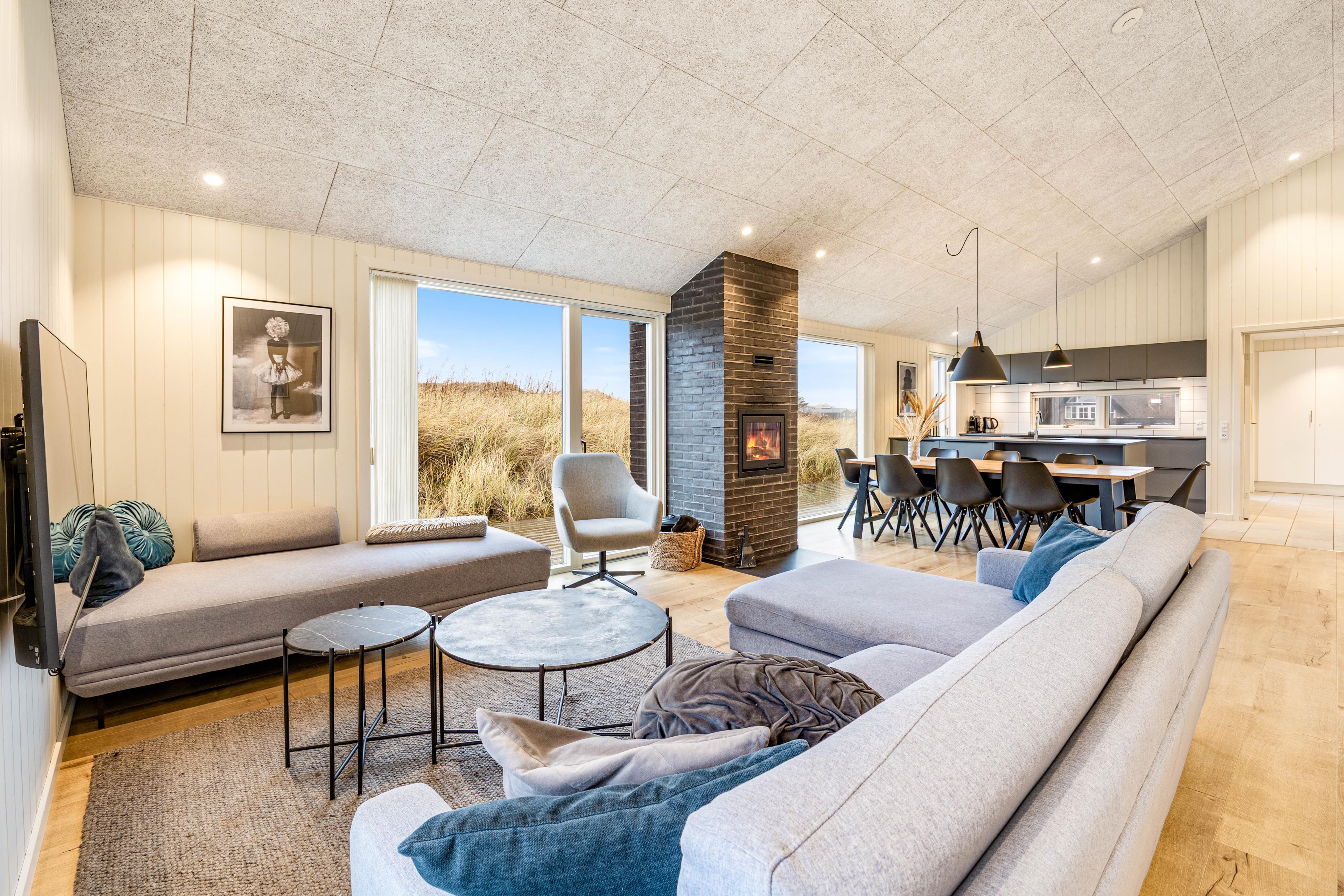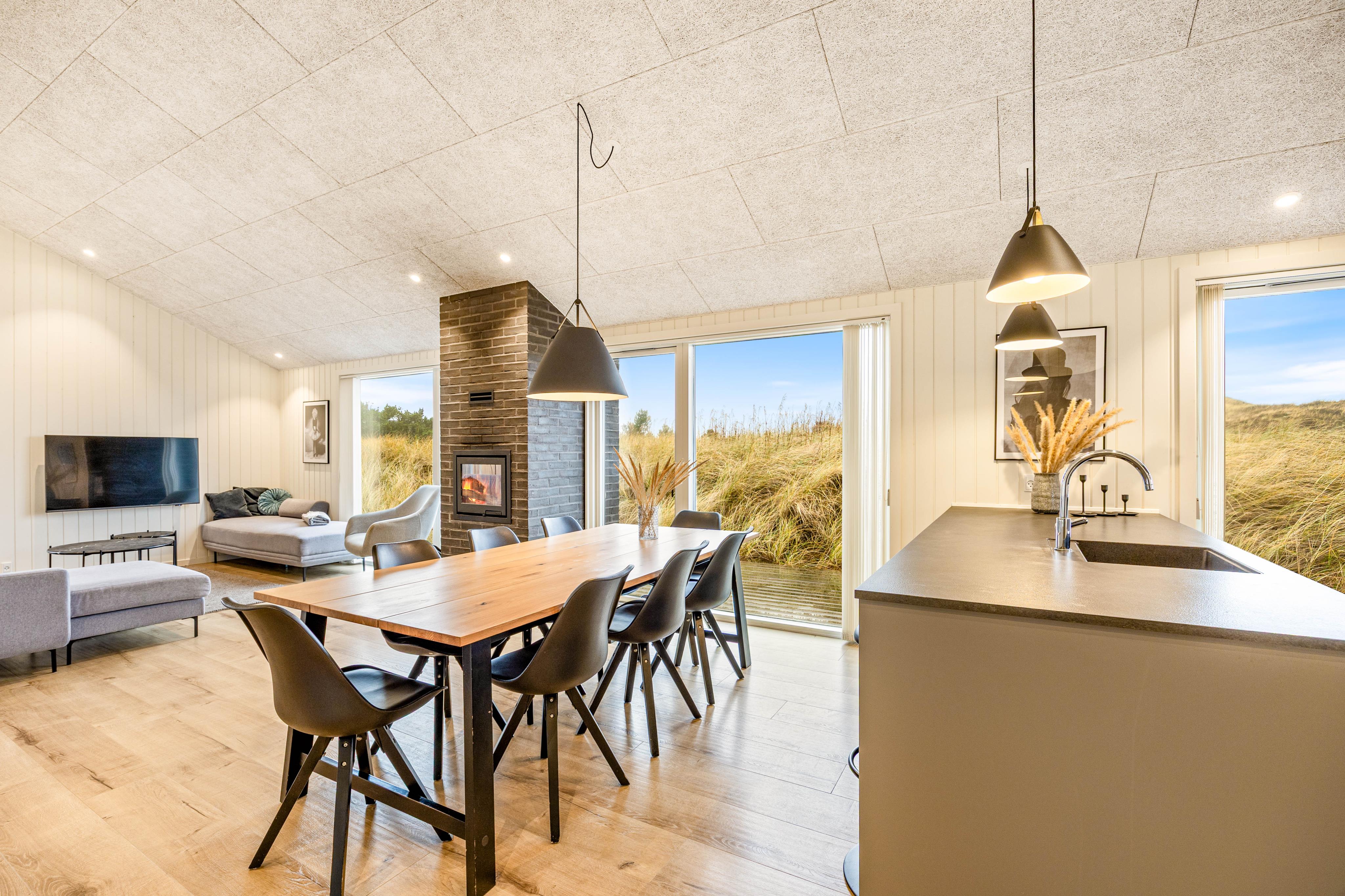 Das große Wohnzimmer wurde mit der offenen Küche kombiniert. In der Mitte vor der großen Fensterfront und den Terrassentüren steht der Kaminofen, der das ganze Jahr hindurch für eine warme und angenehme Urlaubs-Atmosphäre sorgt. Am Esstisch lassen sich wunderbar lange Spieleabende veranstalten, nachdem du mit deiner Familie oder deinen Freunden in der großen Küche gekocht hast.