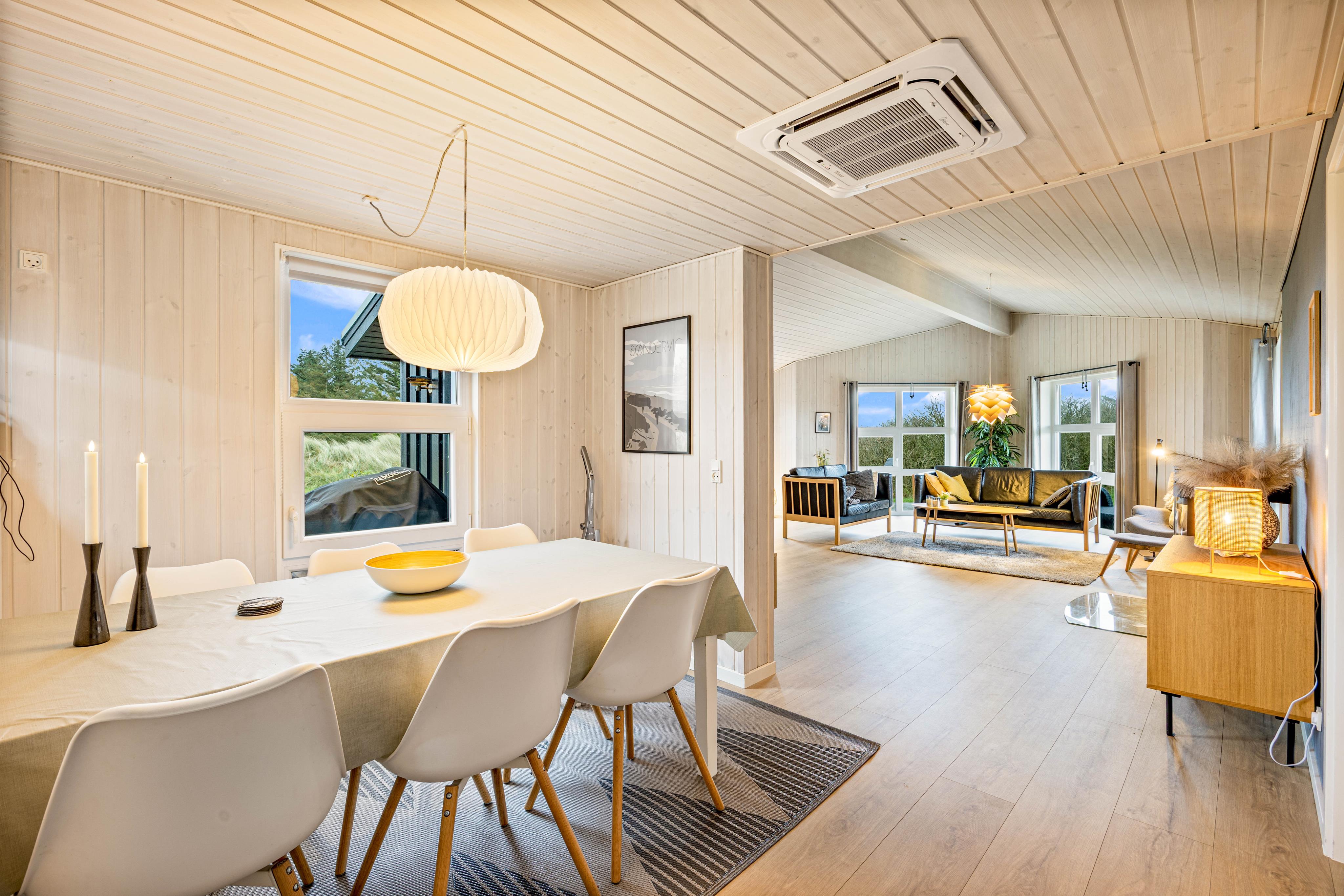 Vom Wohnzimmer aus gibt es auch einen direkten Zugang zur Holzterrasse, die fast um das gesamte Ferienhaus herumführt. Im Wohnzimmer gibt es auch große Panoramafenster, die viel schönes Sonnenlicht ins Haus lassen und einen schönen Blick auf die umliegende charakteristische jütländische Dünenlandschaft bieten.