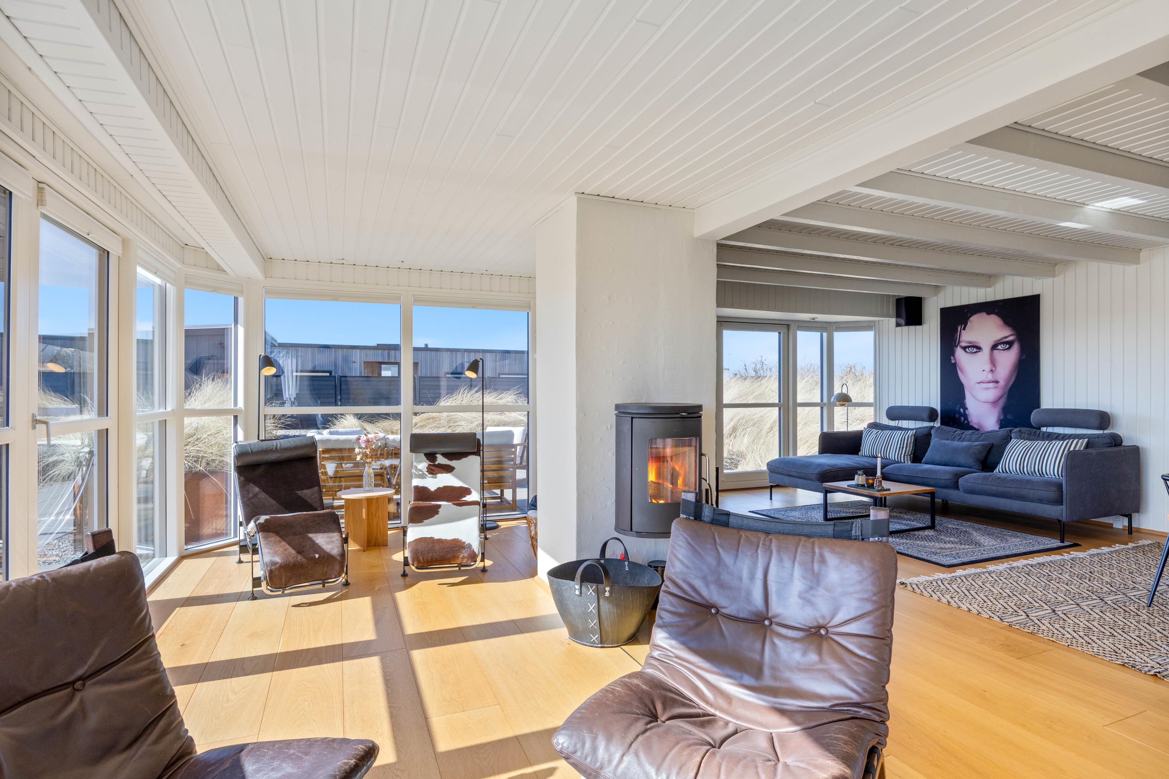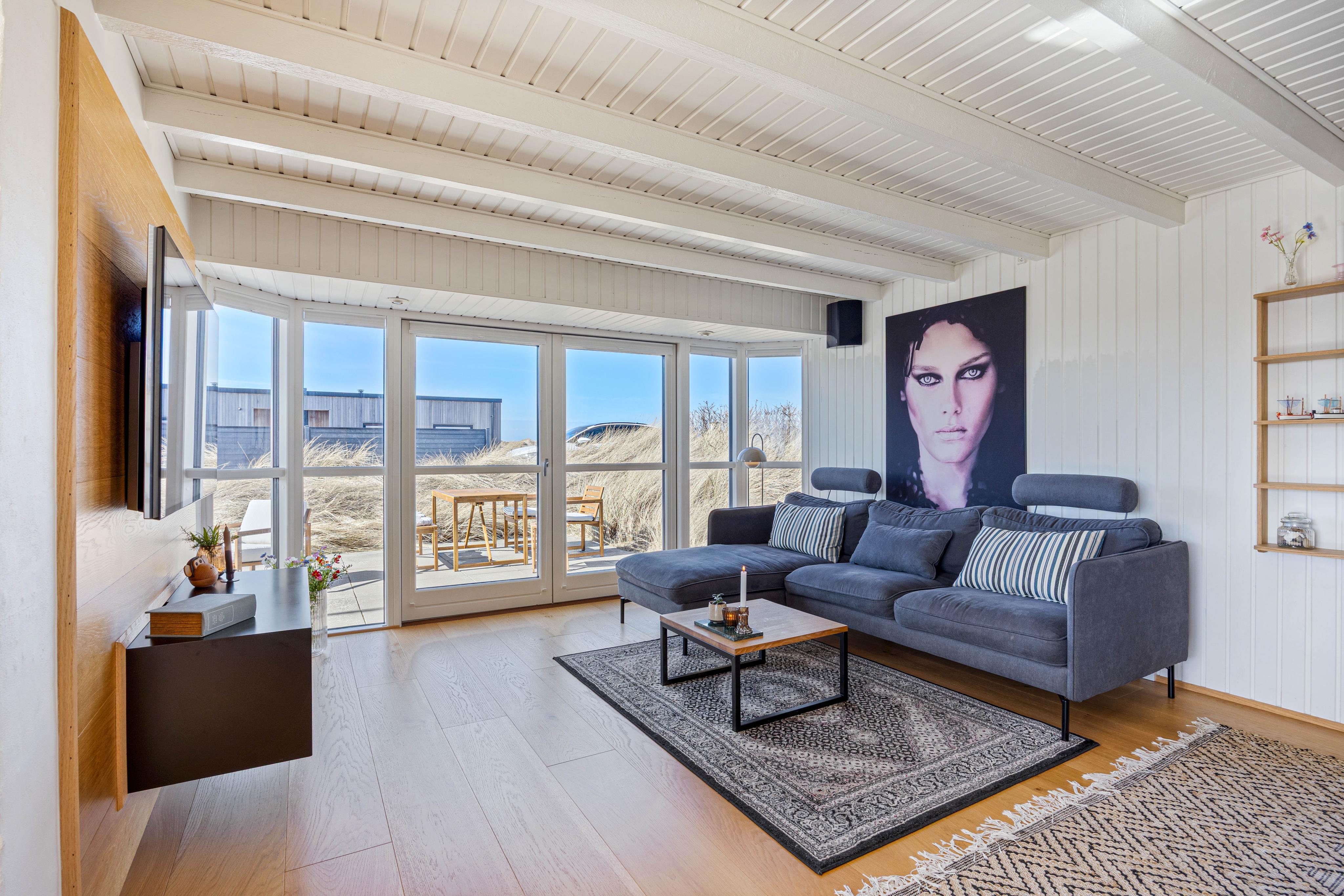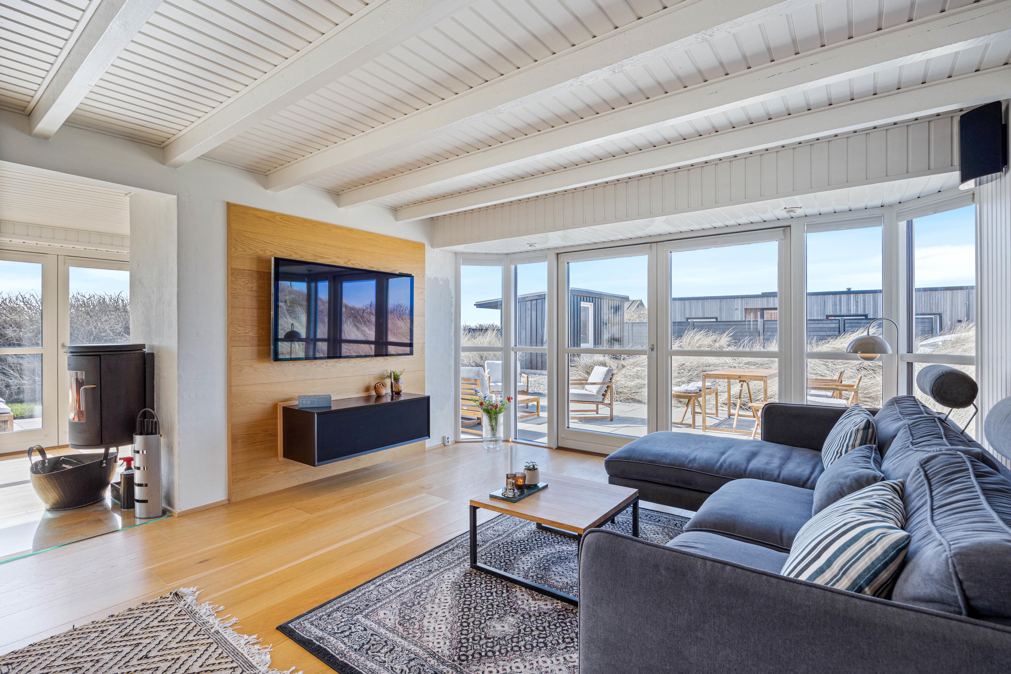 Das Ferienhaus hat eine fantastische Aussicht aus den großen Fenstern. Ihr habt einen schönen Blick über die Dünen, auf das Meer und den Fjord.