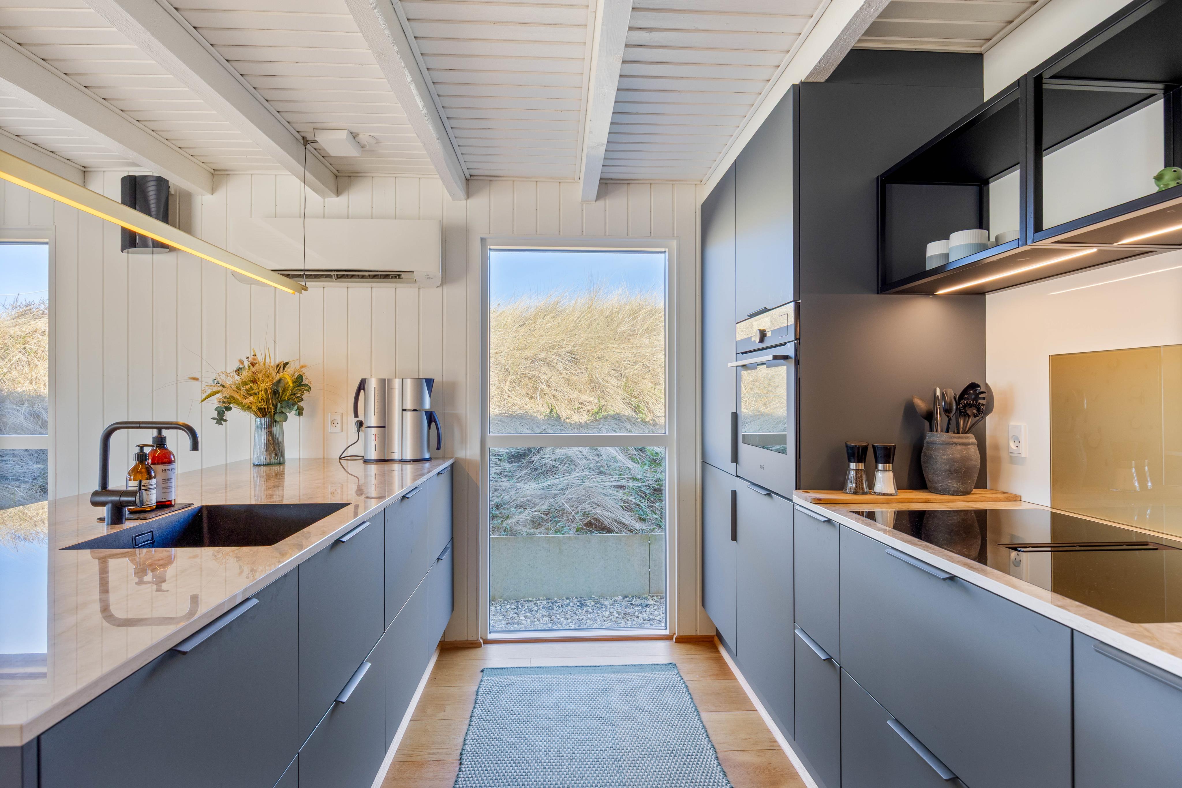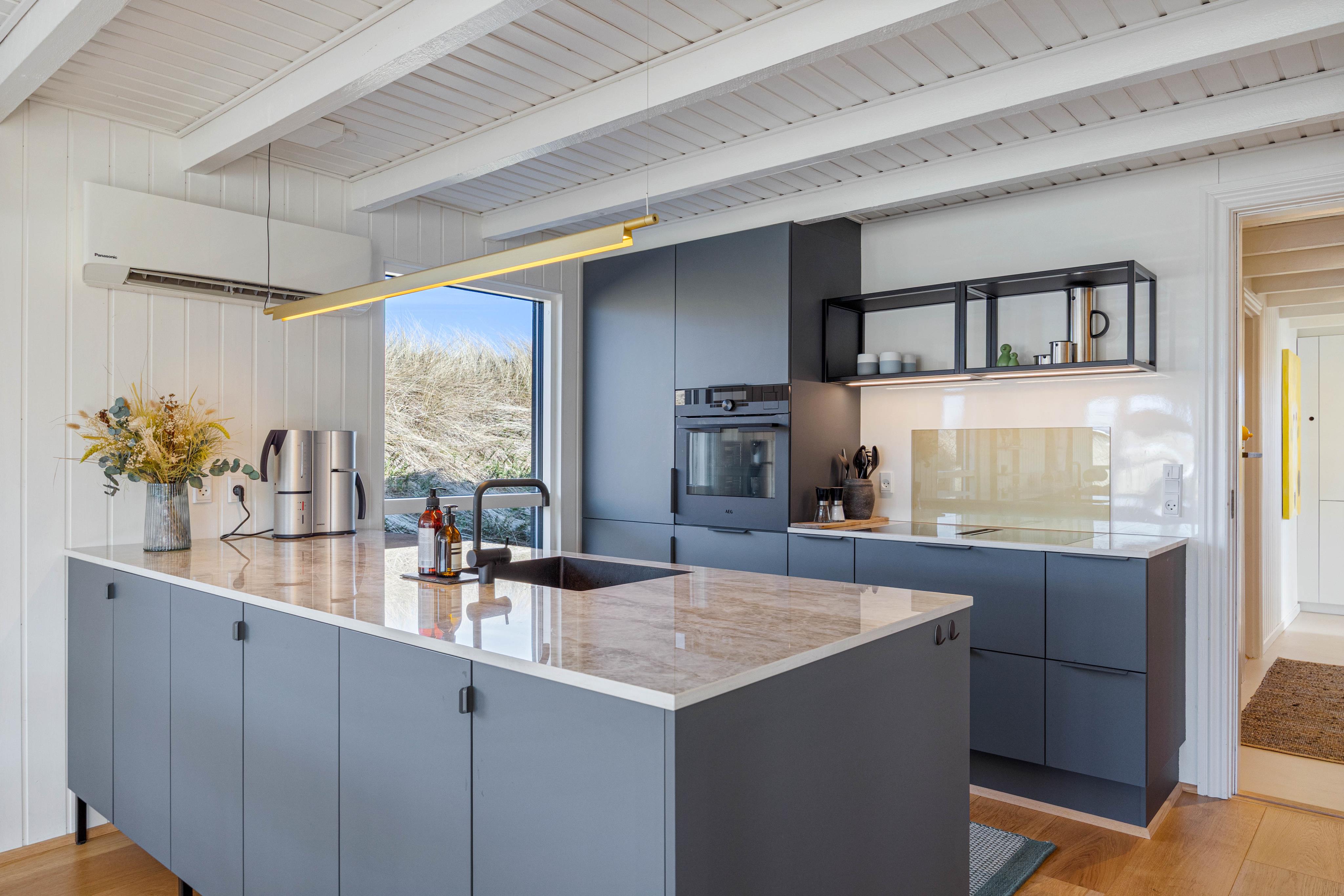 Wenn ihr das Ferienhaus betretet, werdet ihr euch sofort wohlfühlen. Es ist sehr schön und hell eingerichtet, mit weißen Wänden und Decken, was sehr einladend ist. Die moderne Küche und das Wohnzimmer sind miteinander kombiniert, sodass ihr euch bei der Zubereitung des Abendessens oder bei der Planung eurer nächsten Urlaubsaktivitäten austauschen und entspannen könnt. Nach dem Essen erledigt der Geschirrspüler den Abwasch für euch, und ihr könnt es euch auf dem Sofa gemütlich machen und die Seele baumeln lassen. Im Wohnzimmer lassen die großen Fenster besonders an sonnigen Tagen viel Licht herein. Hier befindet sich auch der Kamin, der an kalten Tagen eine hyggelige Atmosphäre schafft. Die knisternden Flammen sorgen für Wärme und echte dänische Ferienhausgemütlichkeit, wenn draußen der Regen an das Fenster prasselt.