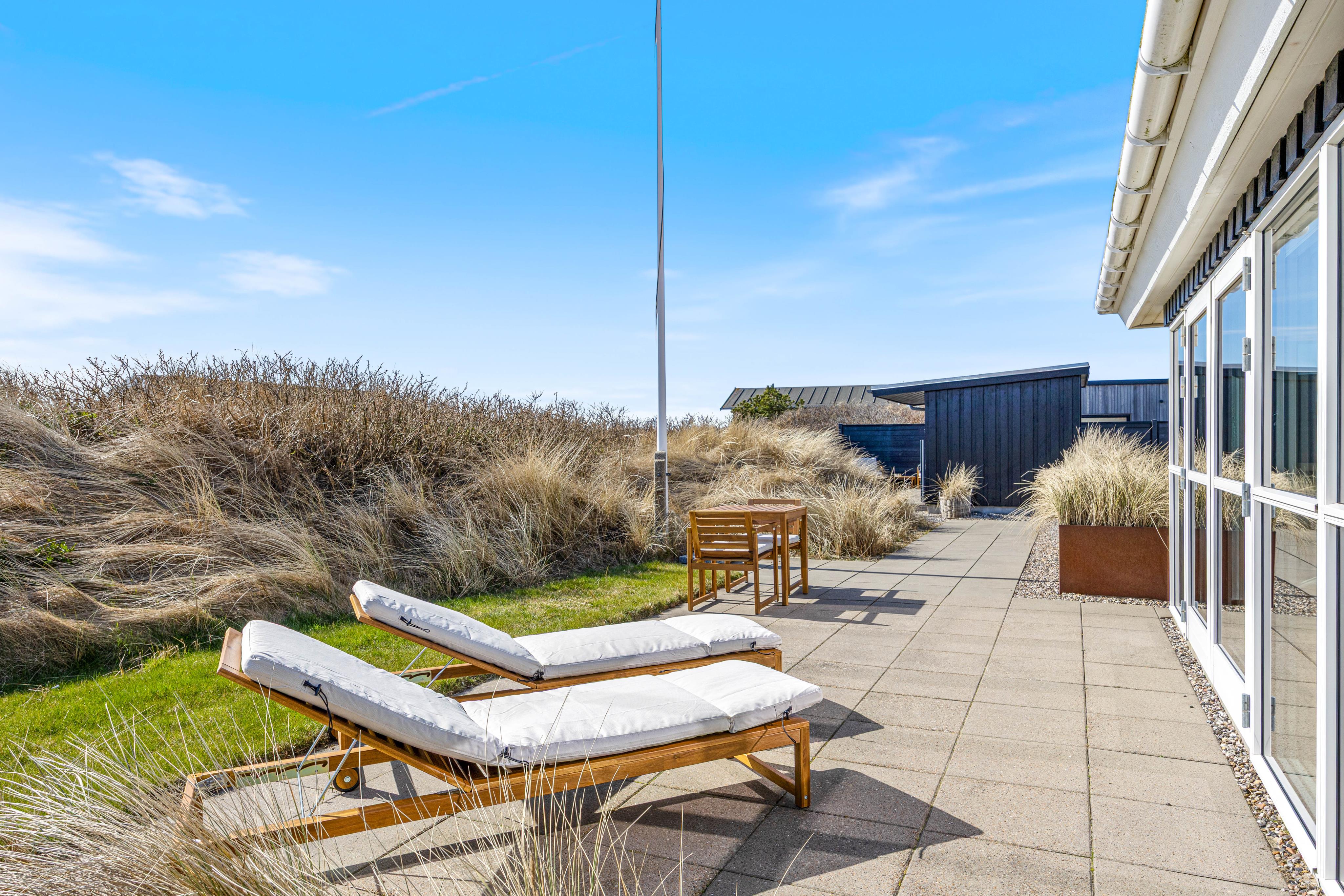 Hochwertig eingerichtetes Ferienhaus in sehr ruhiger Lage mit großem Terassenbereich und einem tollem Blick aus der Dünenlandschaft auf Sondervig hinab. Für jede Tageszeit und Windrichtung ist eine Terrasse vorhanden.
