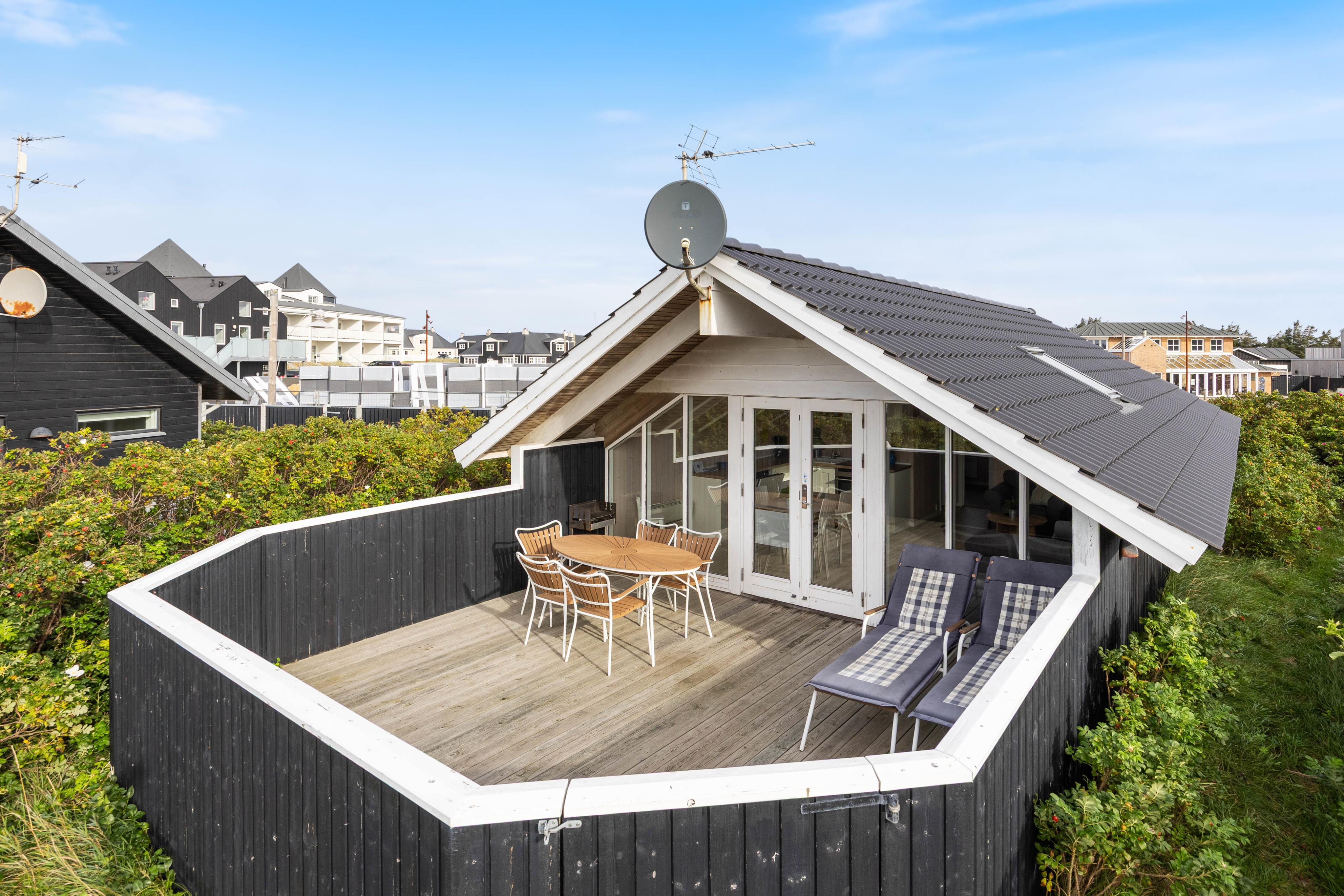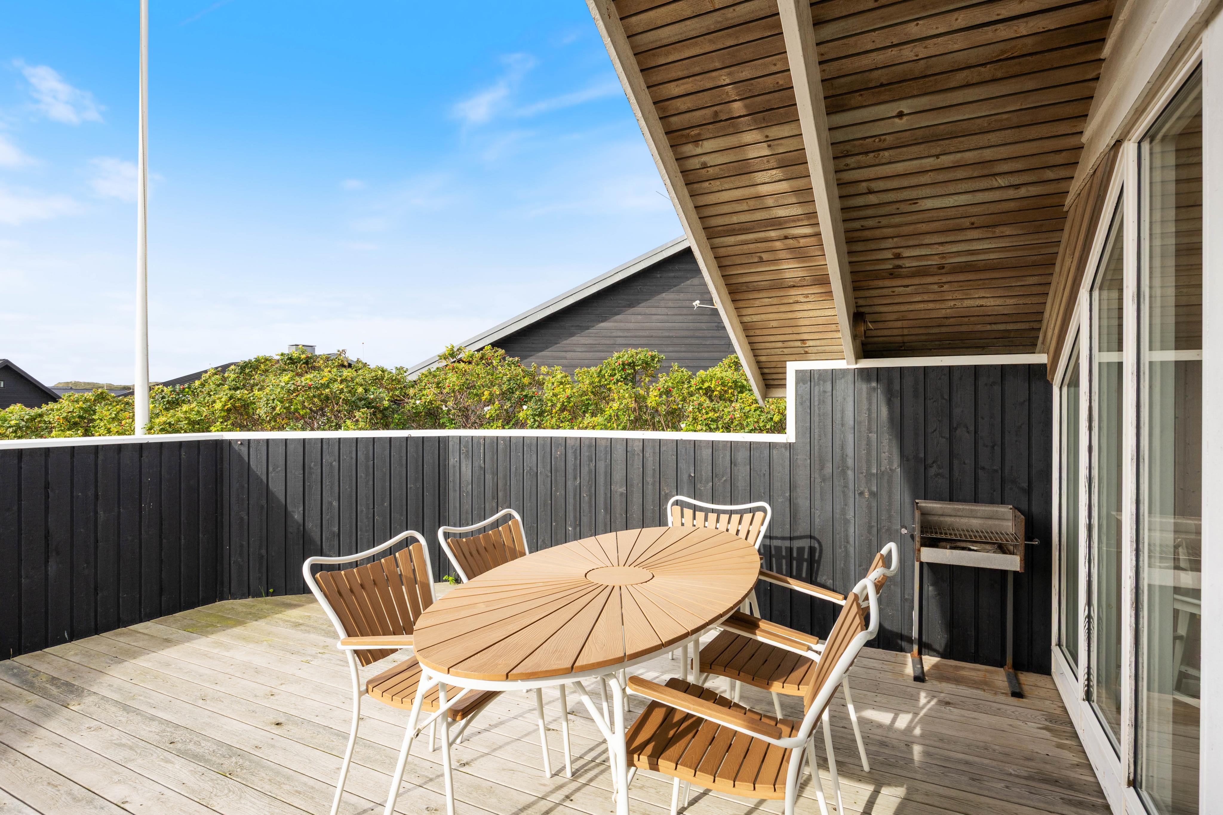 Da die Terrasse auch teilweise überdacht ist, könnt Ihr auch draußen sitzten, falls das Wetter mal nicht mitspielt. Da das Zentrum in Søndervig nur 200 Meter vom Haus entfernt ist, kann man abends auch mal gut außerhalb Essen gehen, ohne das Auto starten zu müssen.