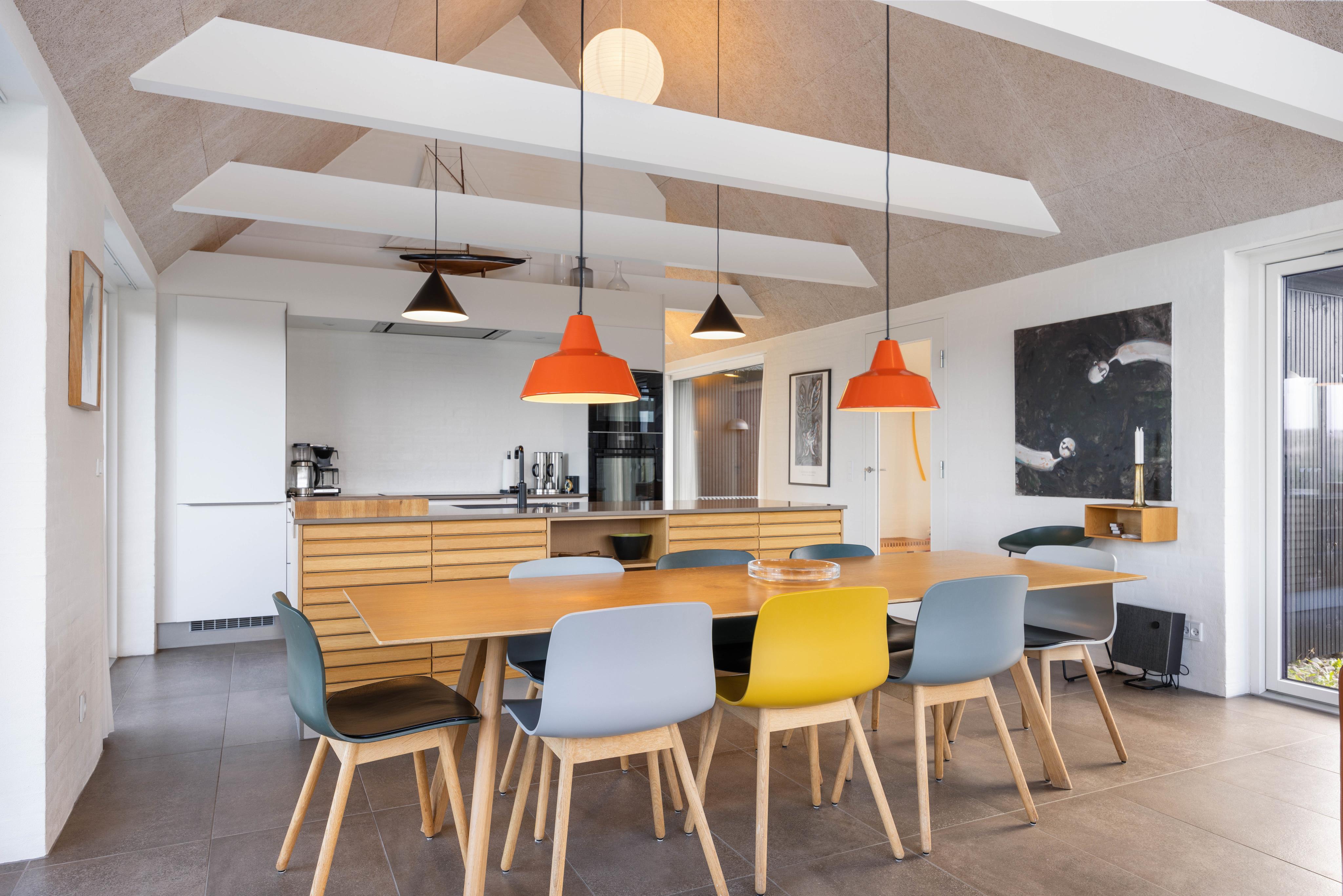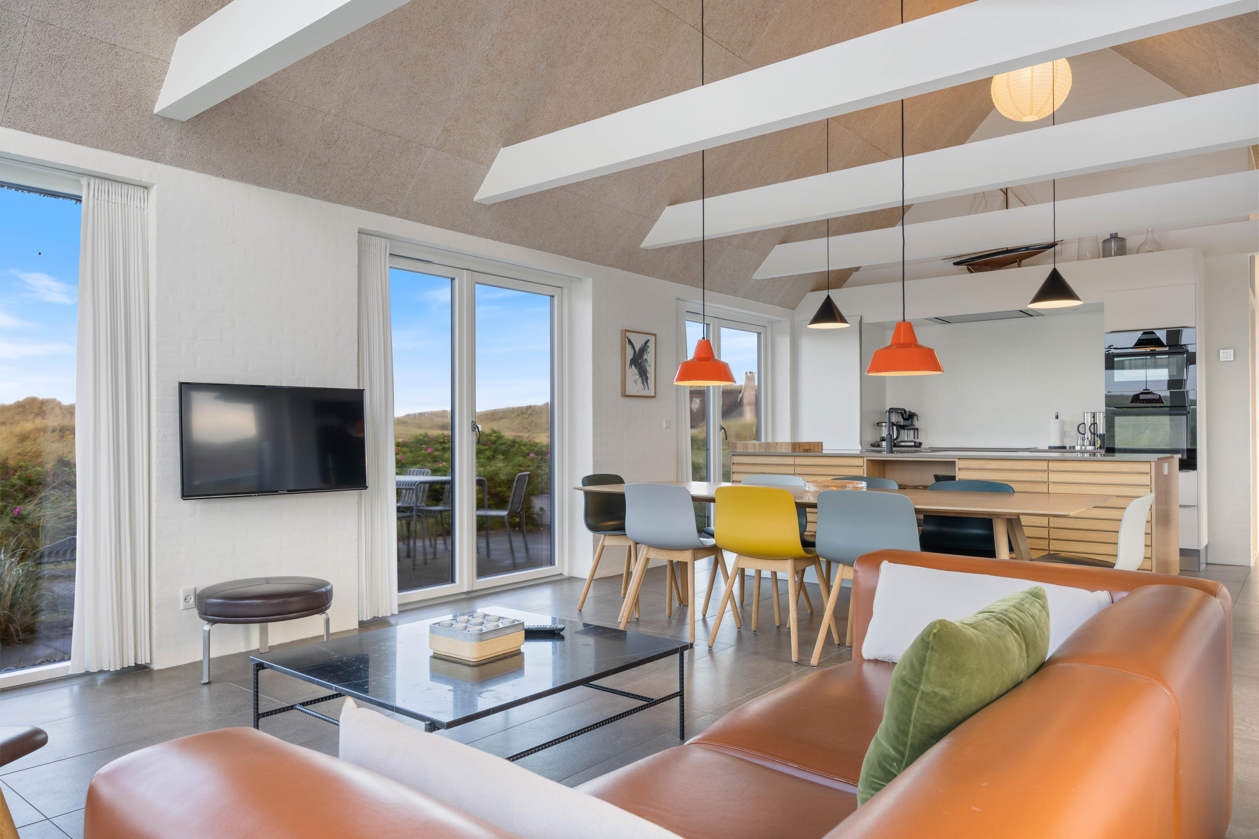Durch das offene Wohnkonzept könnt ihr viel Zeit miteinander verbringen. In der modernen, offenen Küche könnt ihr gemeinsam kochen und die Spülmaschine erledigt den Abwasch damit ihr Zeit habt einen lustigen Spieleabend zu veranstalten oder die nächsten Urlaubstage planen könnt. Dieses Ferienhaus mit seinen großen Fenstern bietet eine einzigartige Atmosphäre. Der gesamte Wohnbereich ist lichtdurchflutet und ihr habt einen fantastischen Blick auf die Dünen. Eine besonders romantische Stimmung habt ihr bei Sonnenuntergang – egal ob ihr in den Dünen sitzt oder in den kalten Jahreszeiten vor dem Kamin kuschelt.