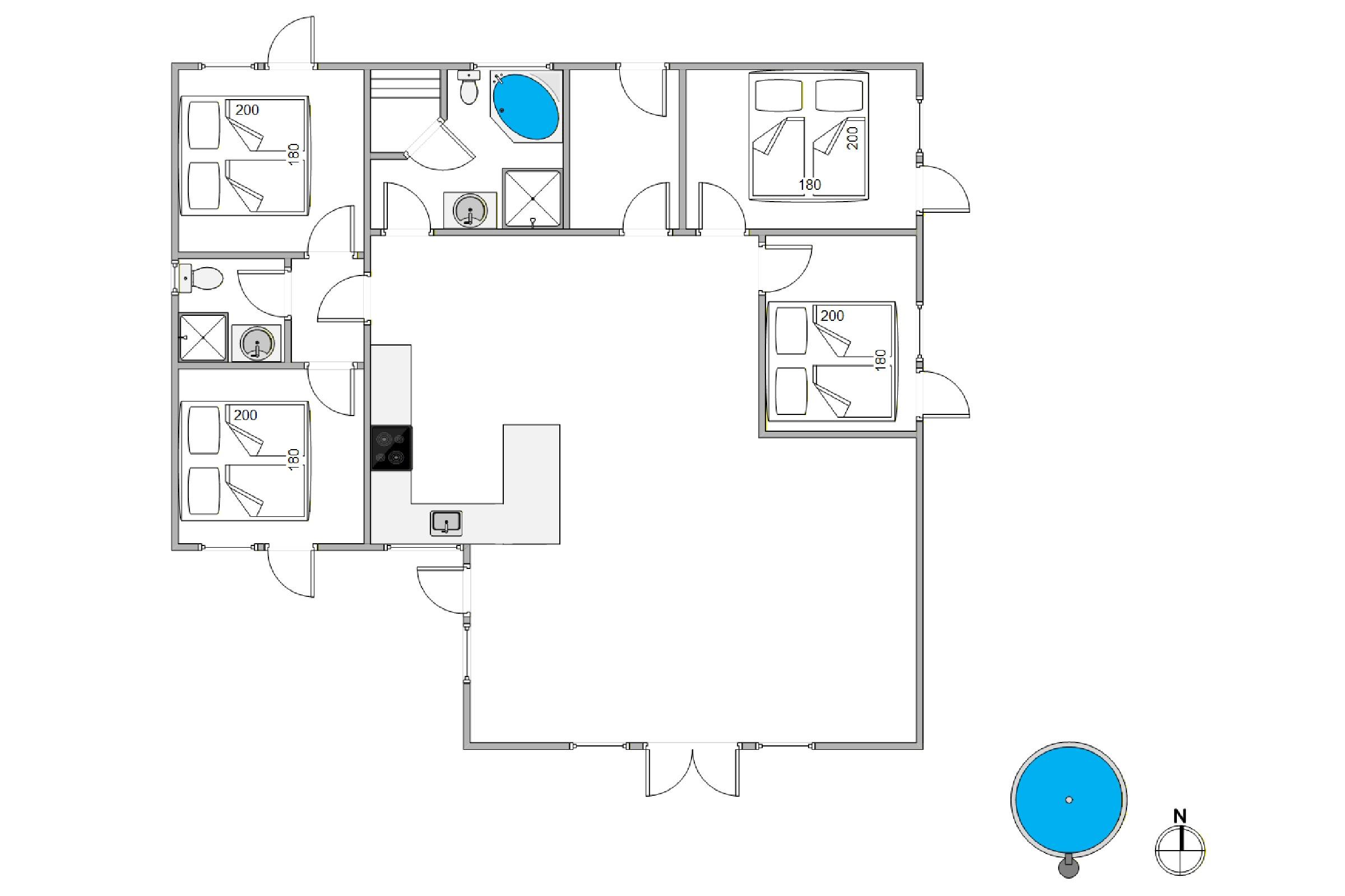 Du kannst dir eines der 4 Schlafzimmer aussuchen, die jeweils mit einem Doppelbett ausgestattet wurden. Das Besondere ist zudem, dass die Schlafzimmer alle eine Terrassentür haben, sodass du gleich am Morgen die frische Luft genießen kannst. Durch die Fußbodenheizung hast du aber immer warme Füße.