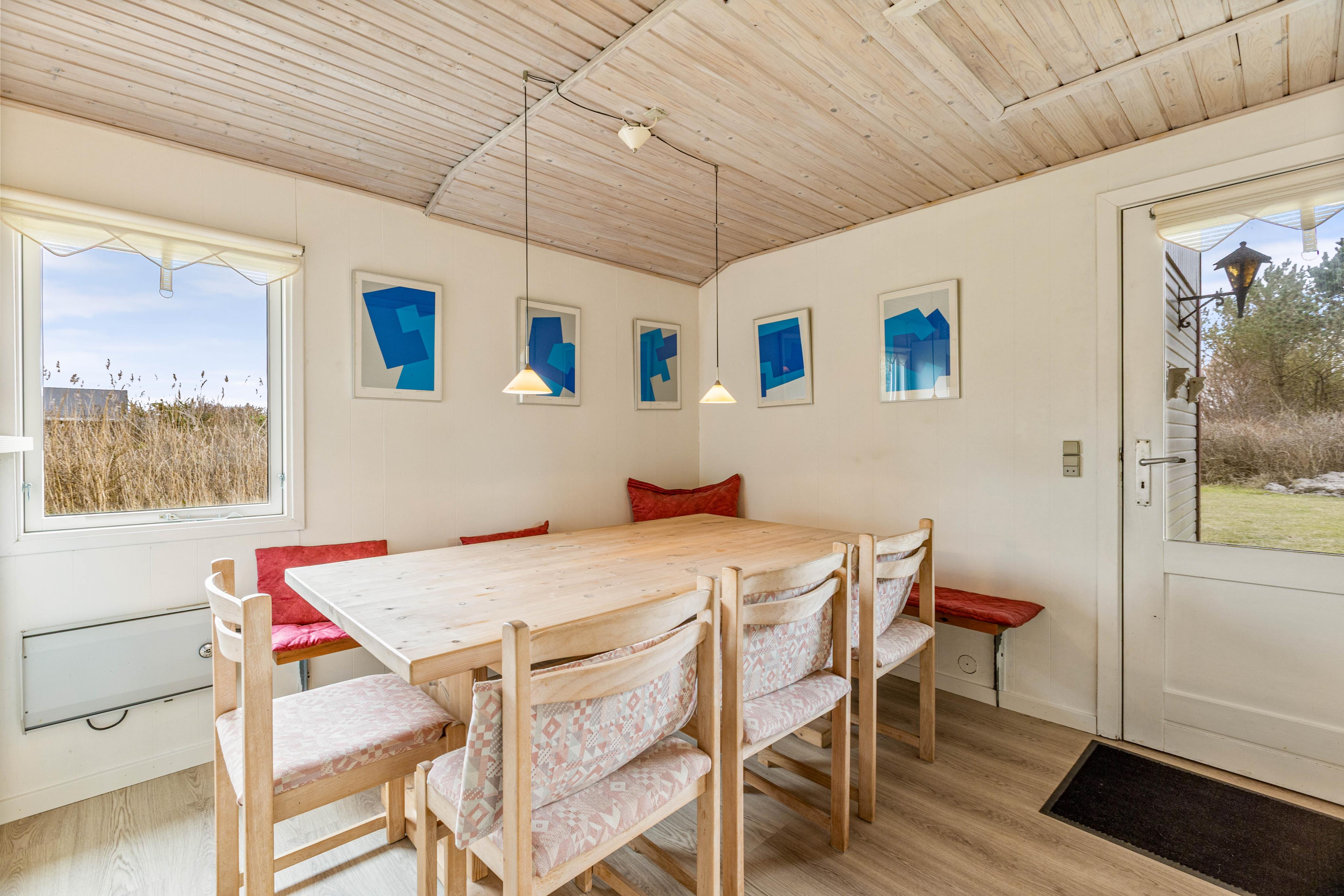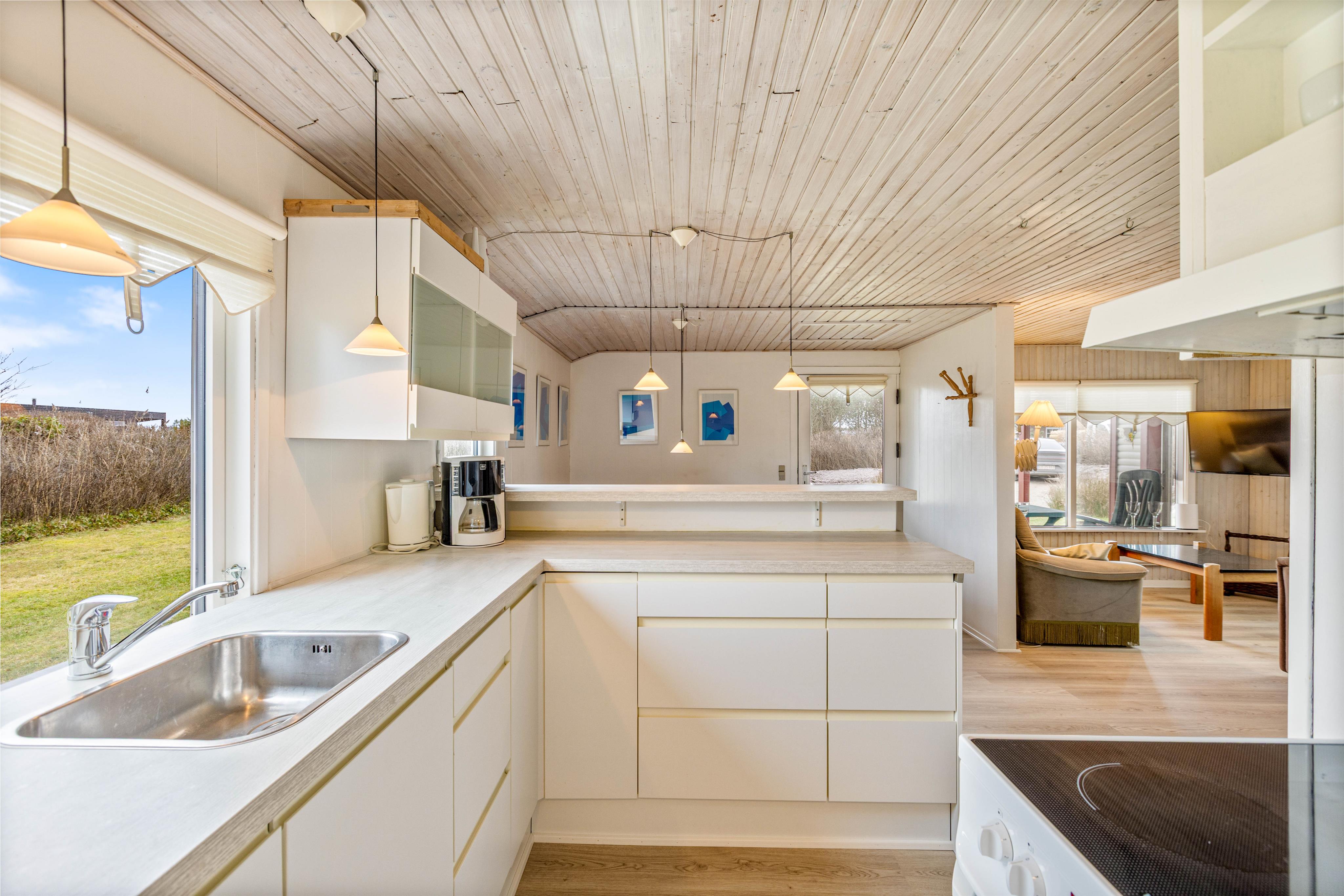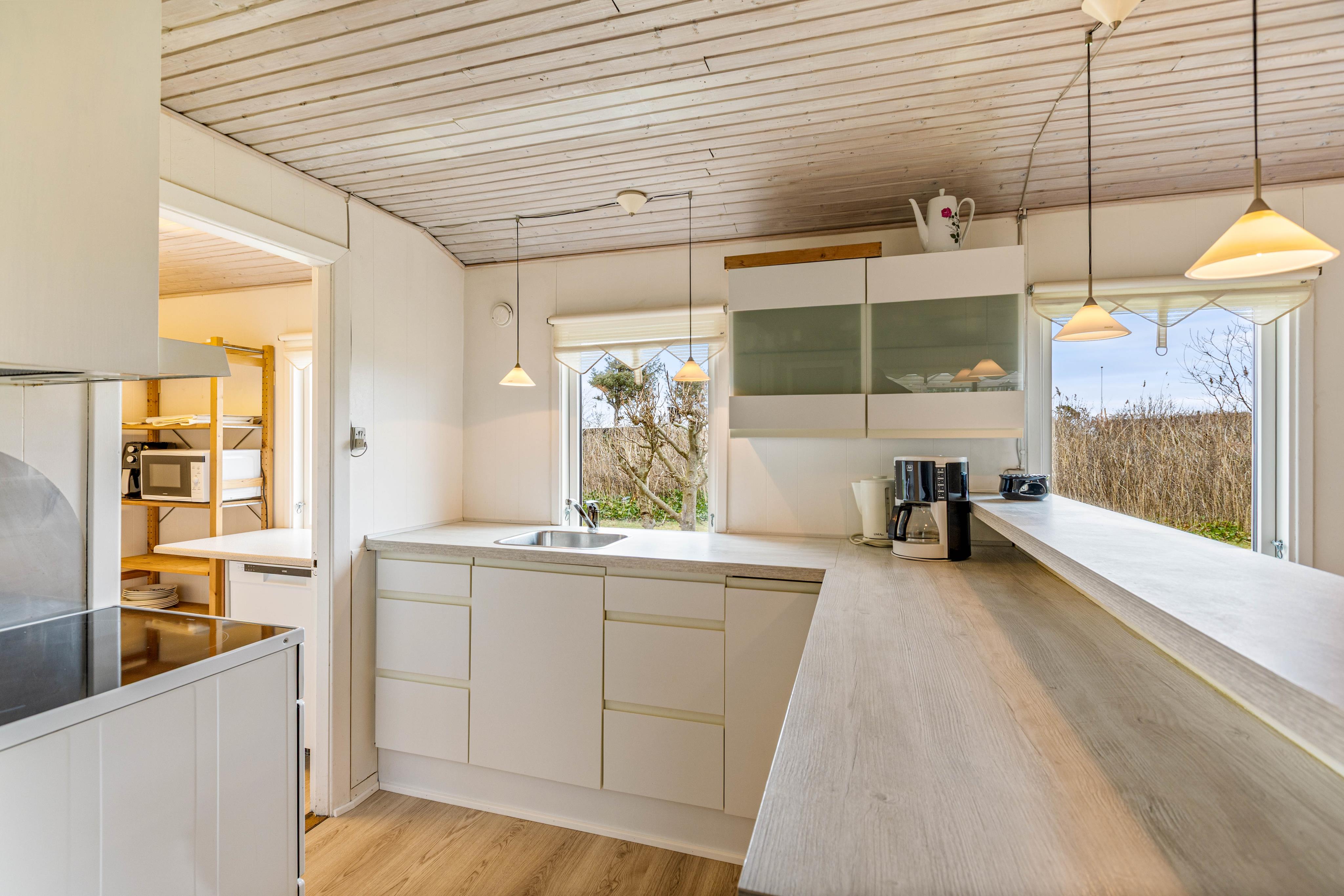 Die Küche ist gut ausgestattet und bereit für eure kulinarischen Abenteuer. Sie verfügt über eine praktische Spülmaschine, mit der ihr nach einer köstlichen Mahlzeit den Abwasch ganz leicht erledigen könnt. Hier könnt ihr gemeinsam kochen, lachen und genießen, während draußen die frische Nordseeluft weht.Der offene Wohnbereich ist das Herzstück eures Ferienhauses in Søndervig. Ein Kamin sorgt für wohlige Wärme und eine gemütliche Atmosphäre, besonders an kühleren Tagen. Ihr werdet es lieben, euch mit einem guten Buch oder in geselliger Runde am knisternden Feuer zu entspannen. Die Wärmepumpe ergänzt die wohlige Wärme und sorgt für energiefreundliche Gemütlichkeit.