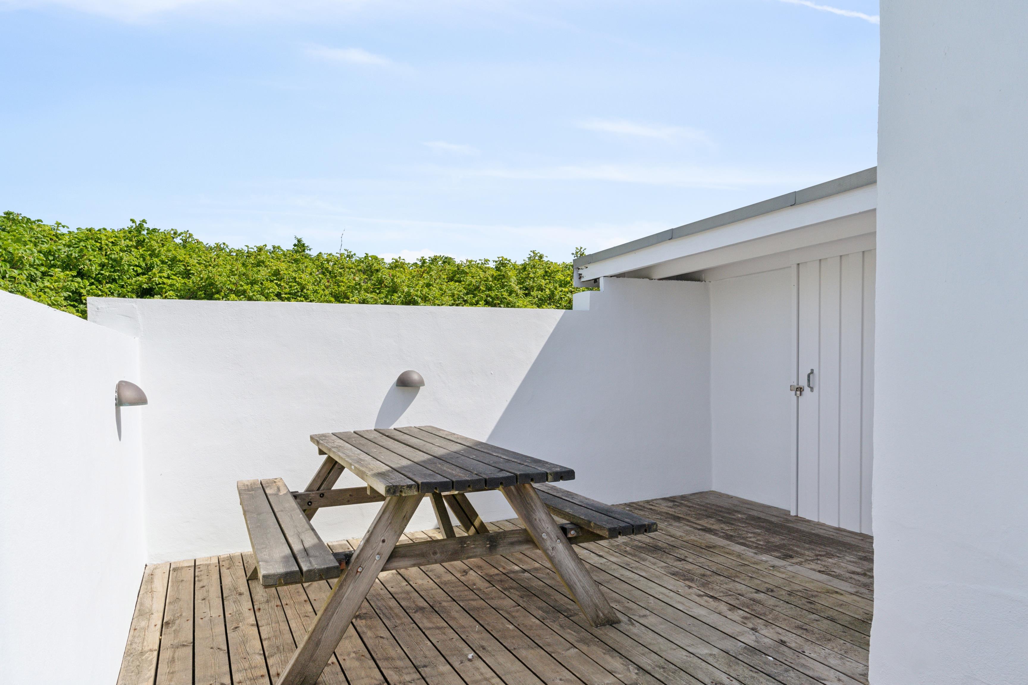 Die Terrasse des Ferienhauses in Søndervig ist gut abgeschirmt und damit auch vor Blicken anderer gut geschützt. Hier könnt ihr es euch auf den Gartenliegen herrlich bequem machen oder aber ein leckeres Grillgericht zubereiten.