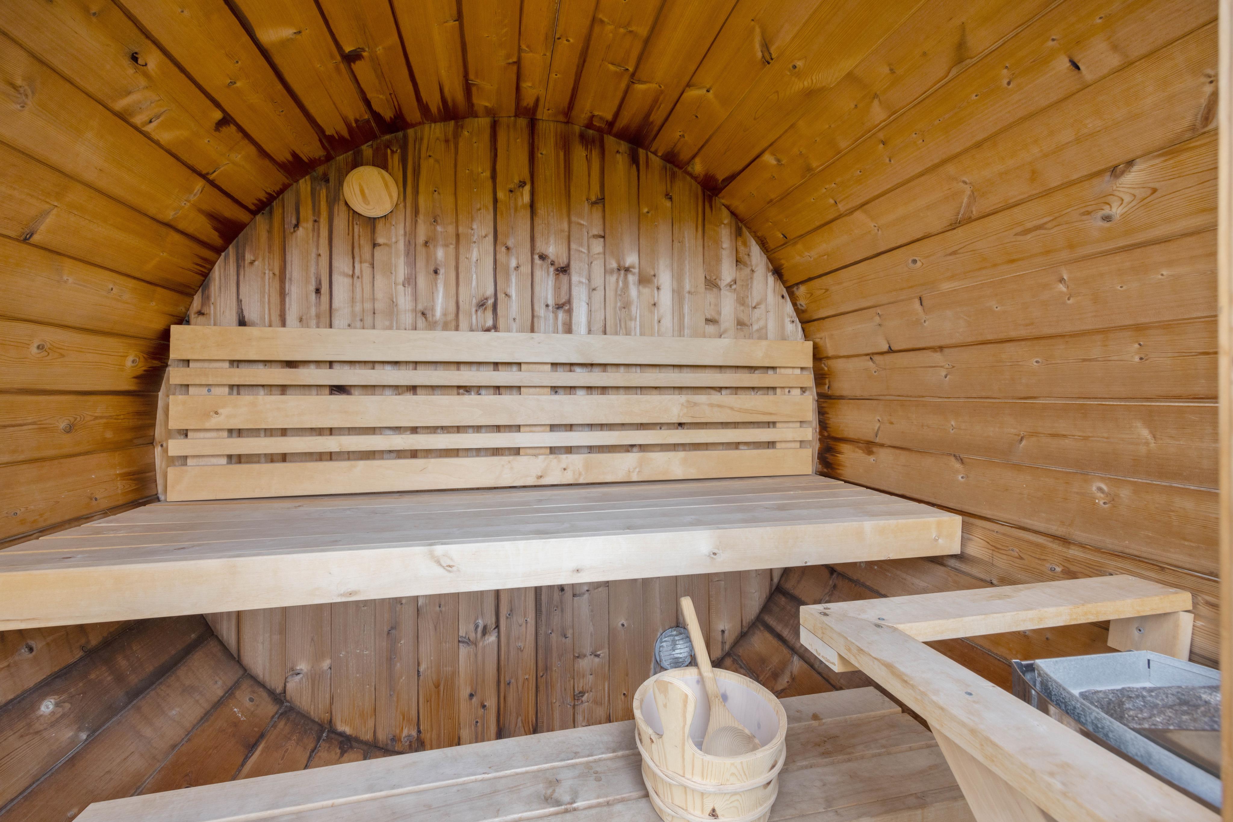 Gleich neben dem Nebengebäude befindet sich die Sauna des Ferienhauses. Hier werdet ihr entspannte Wellnessmomente, verbunden mit der schönen Aussicht, genießen.