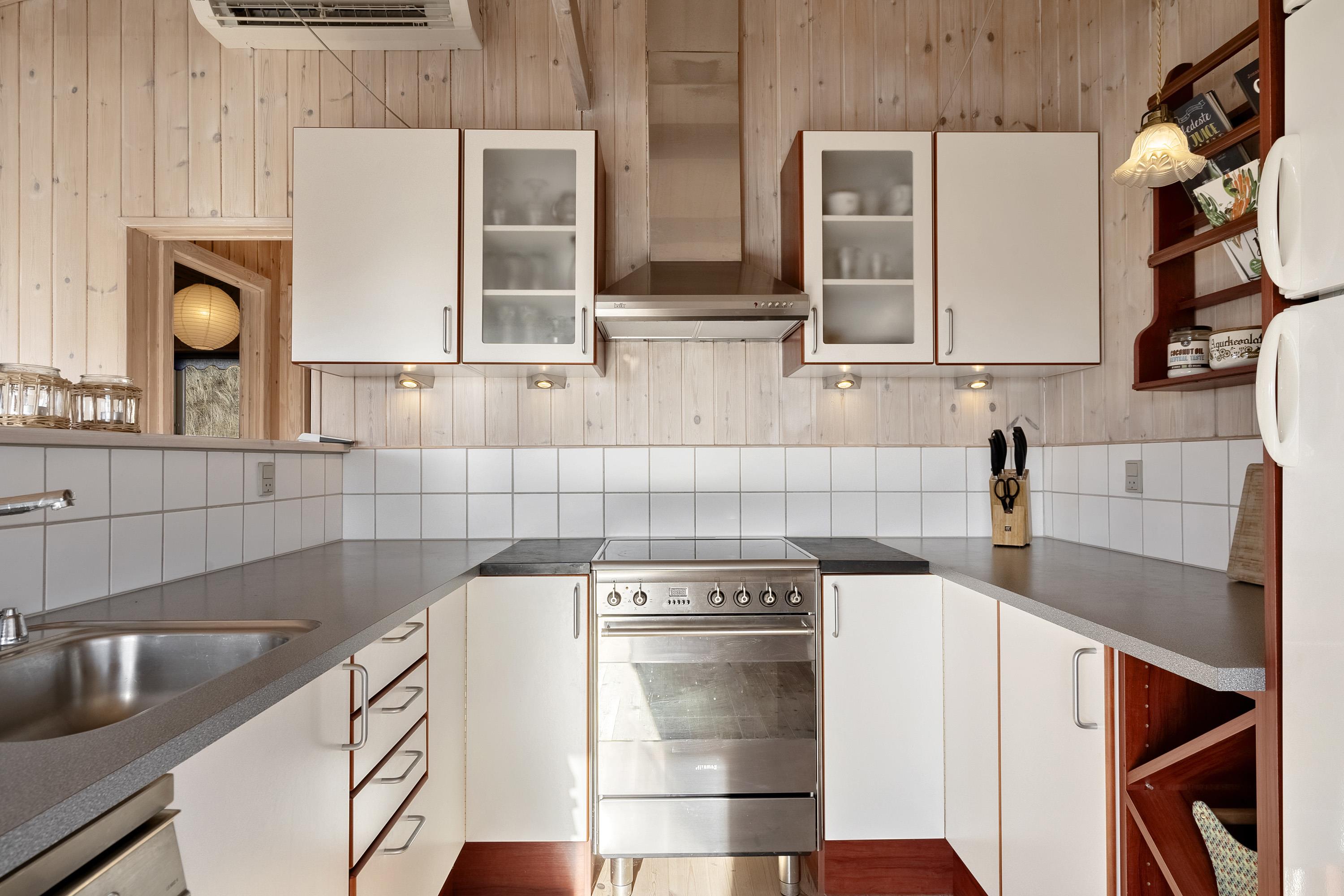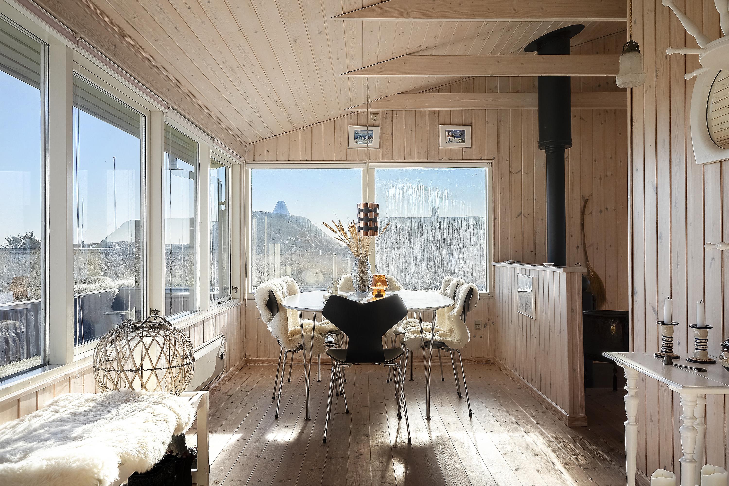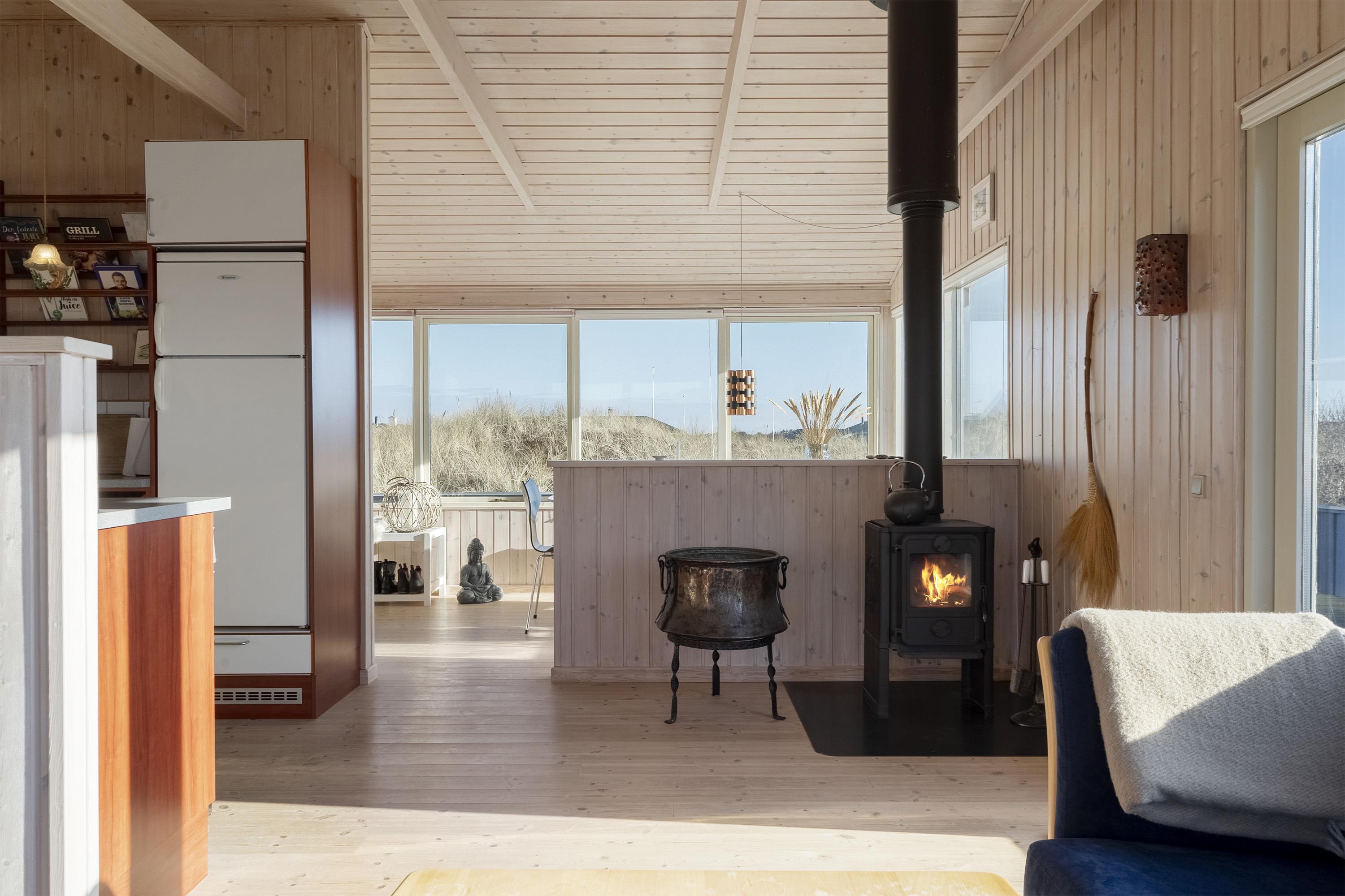 Im Mittelpunkt steht der offene Wohnbereich, in dem ihr gemeinsam kocht, esst und den Tag ausklingen lasst. Der Holzofen sorgt an kühleren Abenden für eine behagliche Atmosphäre, während die Wärmepumpe das Raumklima effizient und angenehm hält. In der Küche erleichtert euch die Spülmaschine den Alltag, damit mehr Zeit für Strandspaziergänge, Spieleabende oder einfach fürs Nichtstun bleibt. Durch das offene Konzept seid ihr immer miteinander verbunden – ob ihr am Esstisch plant, was ihr morgen unternehmt, oder auf dem Sofa entspannter den nächsten Saunagang ins Auge fasst.