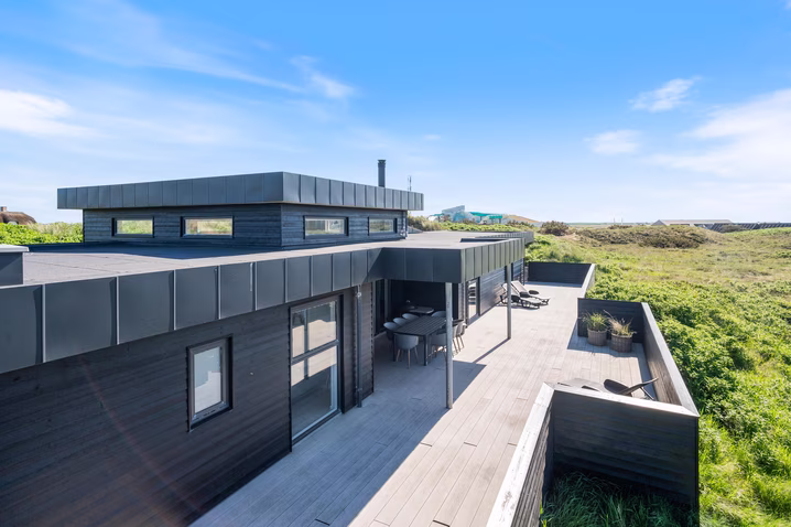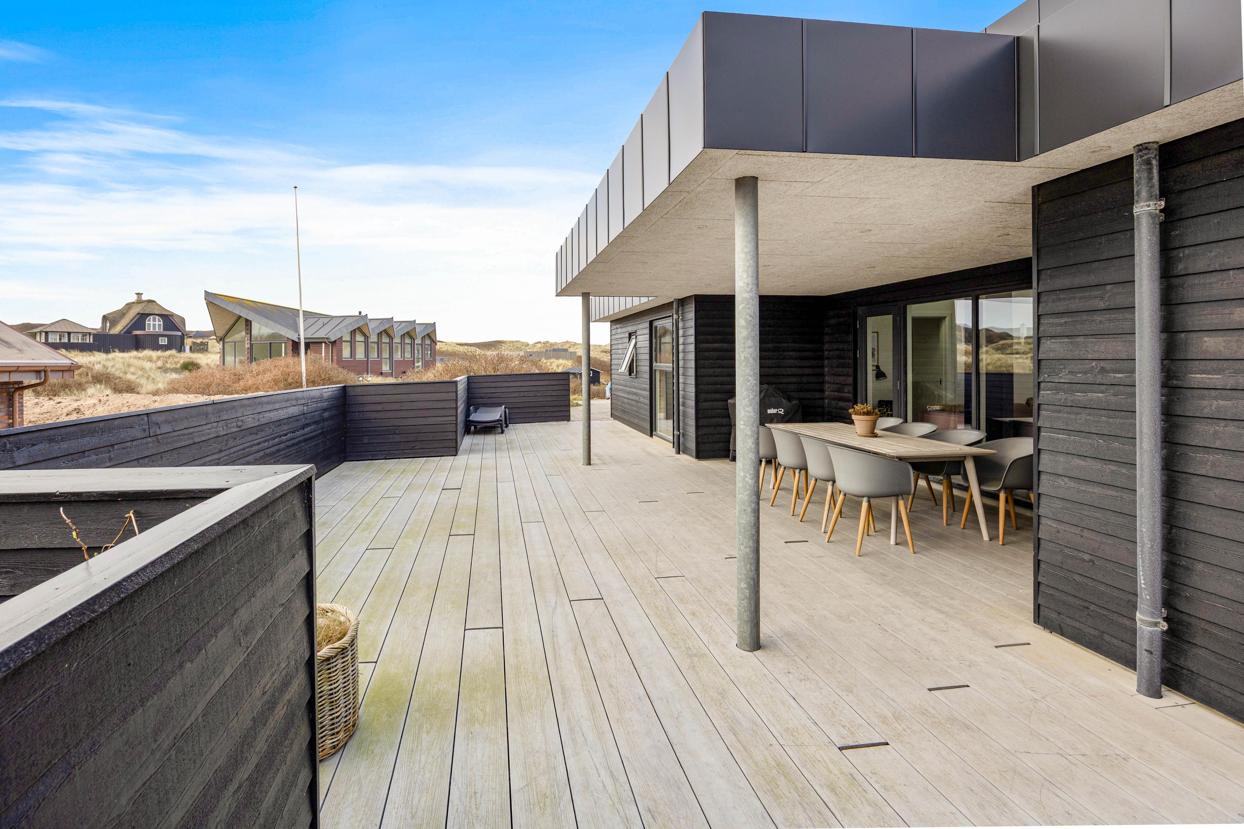 Des Weiteren verfügt das Ferienhaus über eine große Terrasse, die teilweise eingezäunt ist und so vor dem schlimmsten Wind schützt. Die Terrasse ist auch teilweise überdacht, wenn ihr euch vor der Sonne schützen möchtet. So habet ihr viel Platz auf der großen Terrasse und nicht zuletzt eine unbeschreibliche Aussicht auf die westjütländische Landschaft. Natürlich verfügt das Ferienhaus über verschiedene Gartenmöbel, Sonnenliegen und einen Grill, der ideal für die Sommerabende ist.