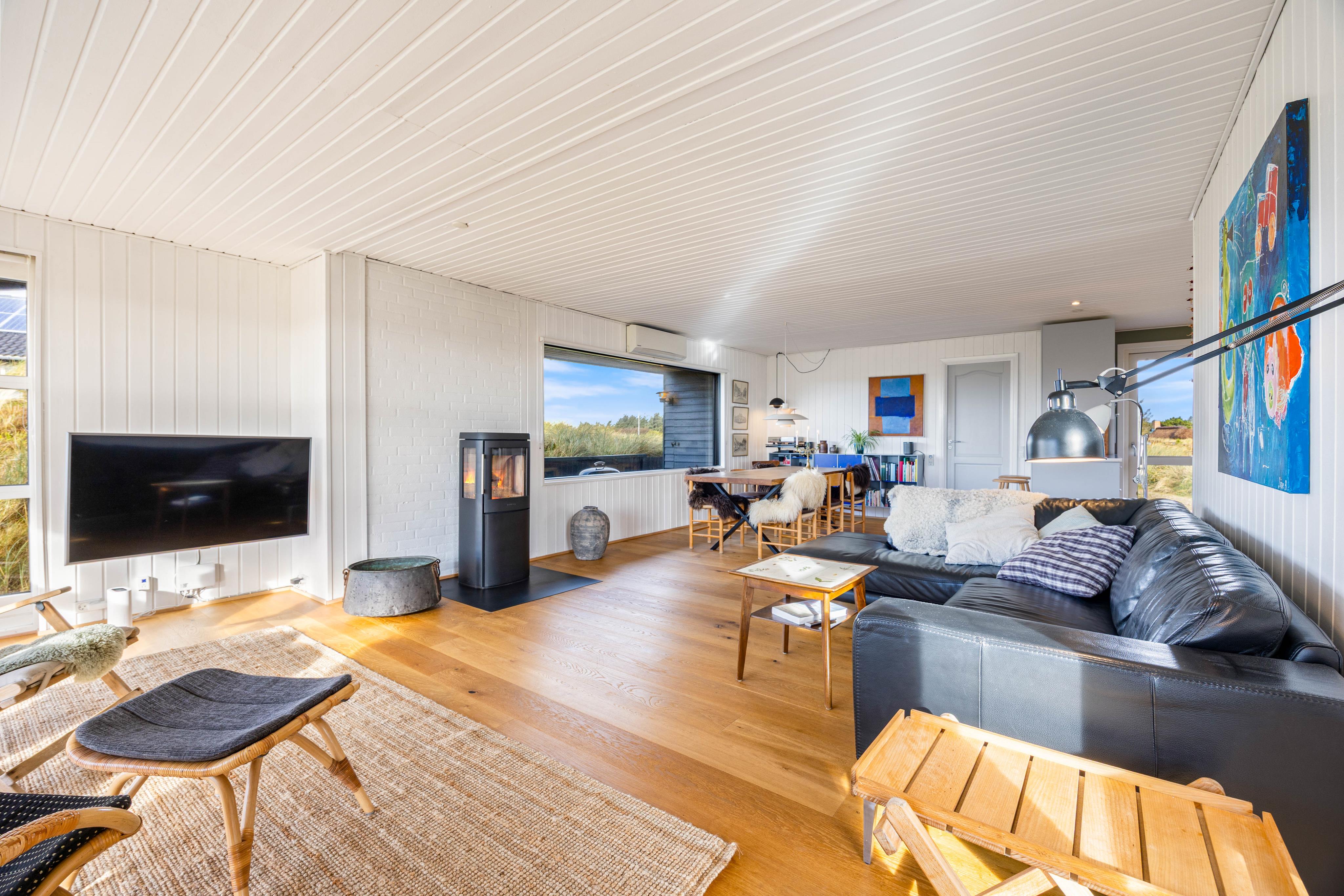 Die offene Küche ist mit dem Wohnzimmer verbunden und bildet somit einen schönen großen Raum, wo sich die ganze Familie zum Beispiel zum fernsehen oder Spiele spielen sammeln kann. Dabei kann der Kamin angezündet werden, der für eine kuschelige Atmosphäre sorgen kann.