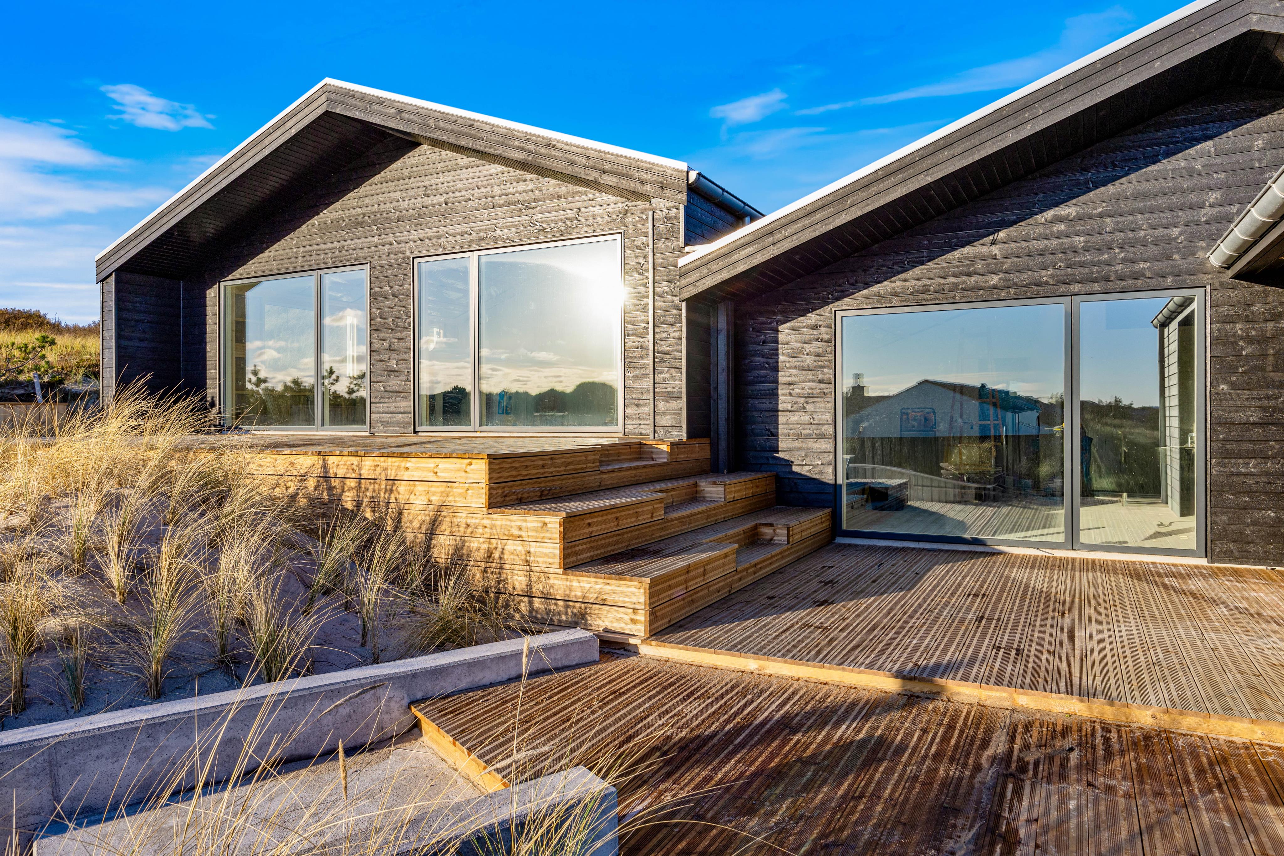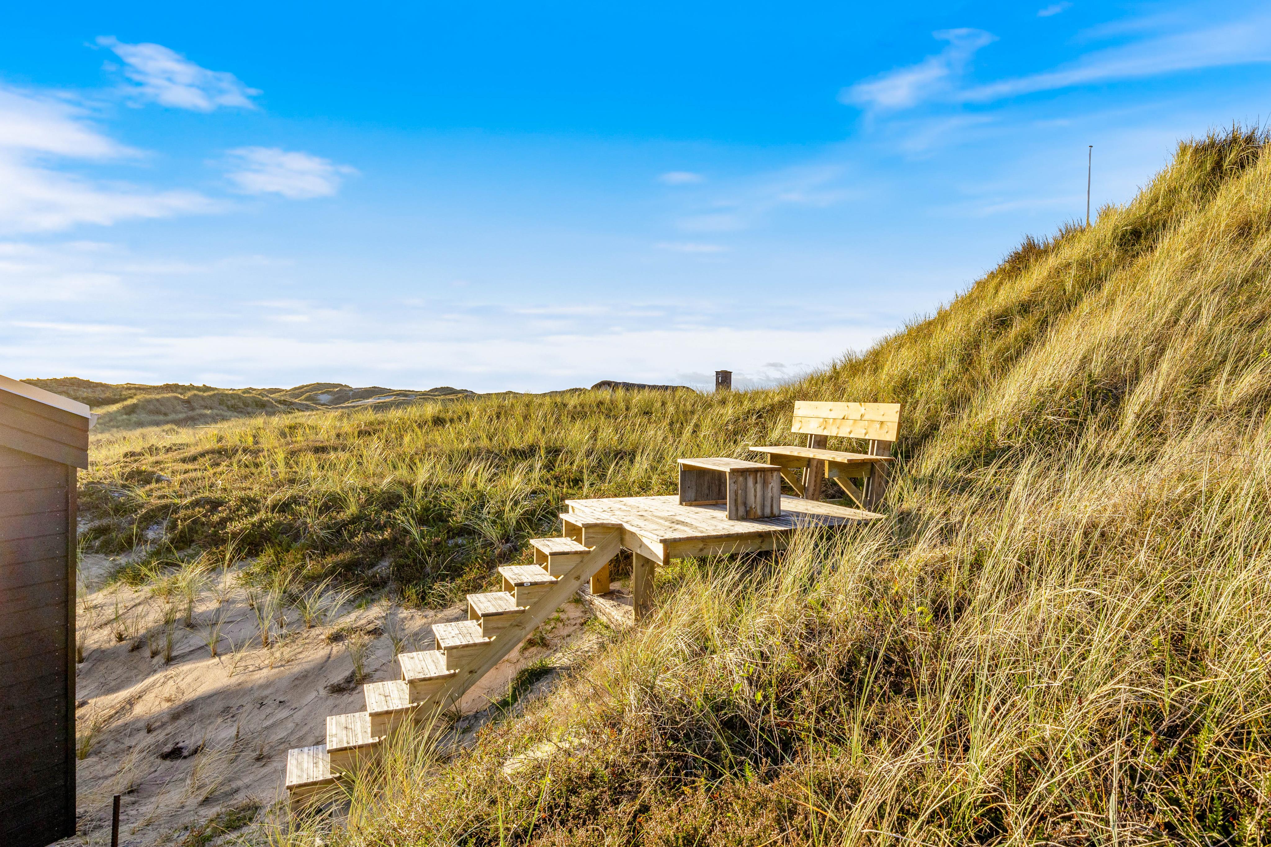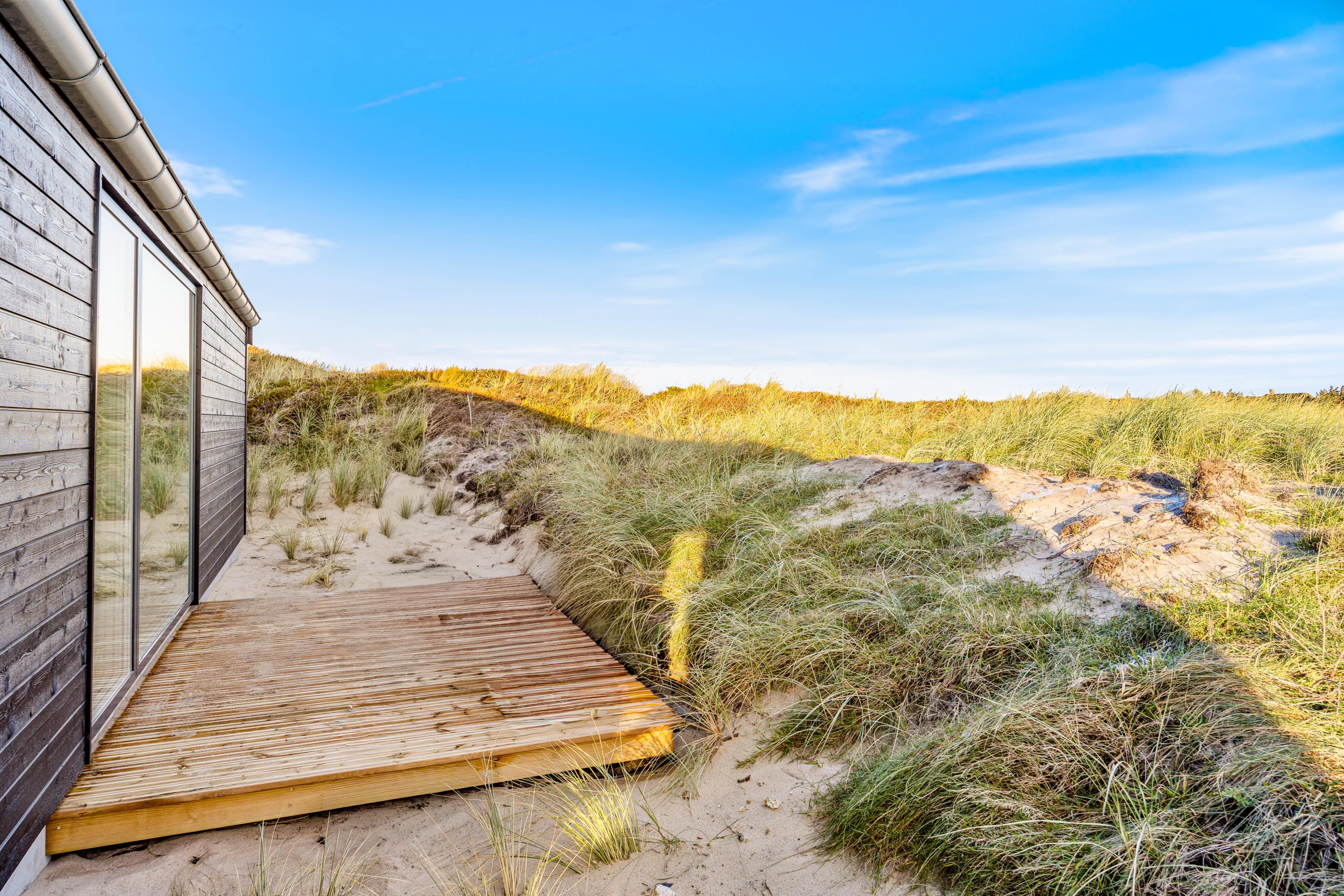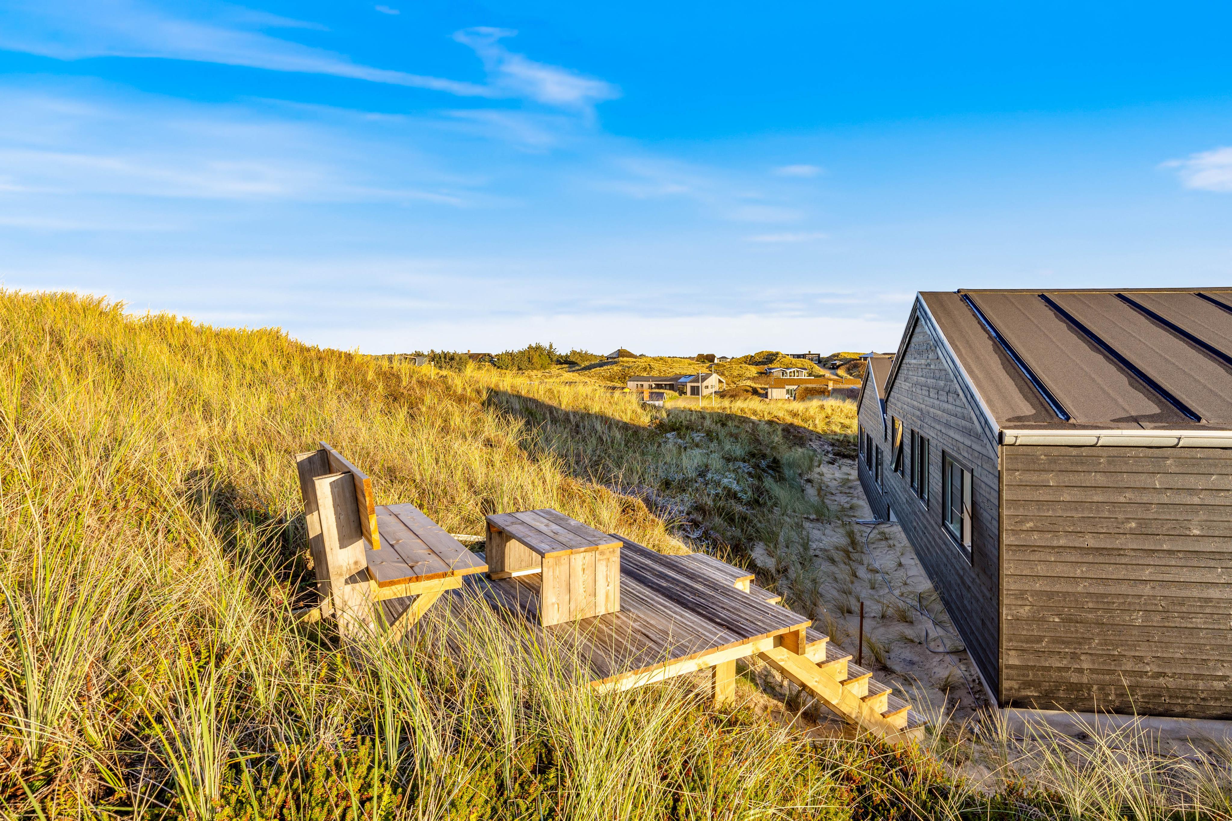 Euer Ferienhaus beeindruckt nicht nur im Innen-, sondern auch im Außenbereich. Verbringt entspannte Stunden auf der offenen, aber abgeschirmten Terrasse, von denen ihr die Schönheit des Natur- und Dünengrundstücks bewundern könnt. Gartenmöbel stehen euch zur Verfügung, um die Sonnenstunden in vollen Zügen zu genießen. Falls euch ein Regenschauer überrascht könnt ihr eure Möbel einfach unter den überdachten Teil der Terrasse stellen. Am Abend wird der Grill angemacht und ihr lehnt euch mit einem Kaltgetränk zurück und lasst den Tag in Ruhe Revue passieren. Der Außenwhirlpool lädt dazu ein, den Tag in wohltuender Entspannung ausklingen zu lassen und unter dem Sternenhimmel Dänemarks zu relaxen.