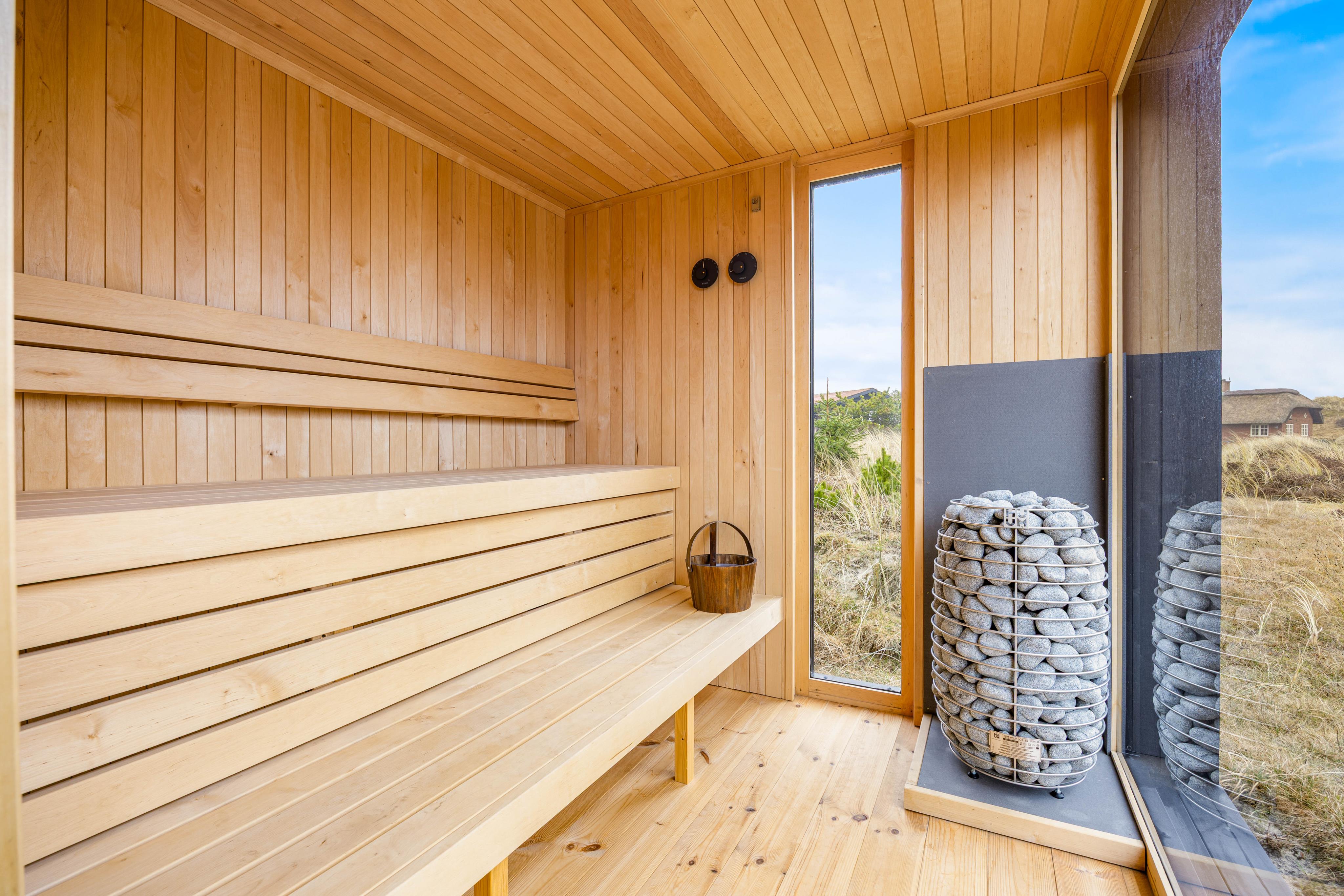 Das Ferienhaus hat eine schöne, nach Südwesten ausgerichtete Terrasse, die eingezäunt und teilweise überdacht ist. Das ist ideal, wenn zur Familie auch kleine Kinder gehören, die gerne auf eigene Faust unterwegs sind. Aber keine Sorge. Auf dem Gelände gibt es zahlreiche Unterhaltungsmöglichkeiten für die Kleinen. Auf dem schönen Naturgelände gibt es ein Spielgerät mit Rutsche und Schaukeln, das die Kinder sicher lieben werden. Eine Außensauna ist für die Erwachsenen eine großartige Möglichkeit, sich nach einem langen Tag am Wasser, zu entspannen